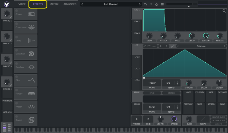 Chorus、Compressor、Delay、Distortion、Eq、Filter、Flanger、Phaser、Reverbとお馴染みのエフェクターが入っております。