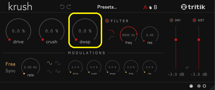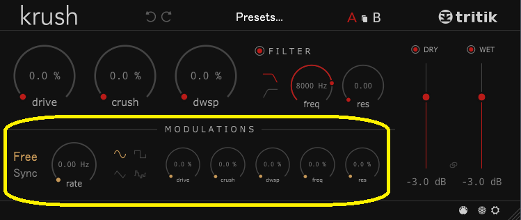 つまり、MODULATIONSのdriveの50%というのは、元々設定しているつまみの位置から0%に向けて、50%の範囲をLFOに合わせるということになります。