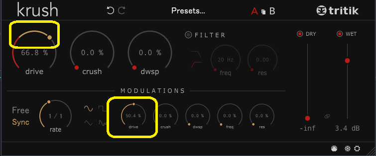 今は、黄色の部分が50%~100%あたりになっていますが、driveのつまみを調整することで、25%~75%の範囲でLFOに合わせることもできます。