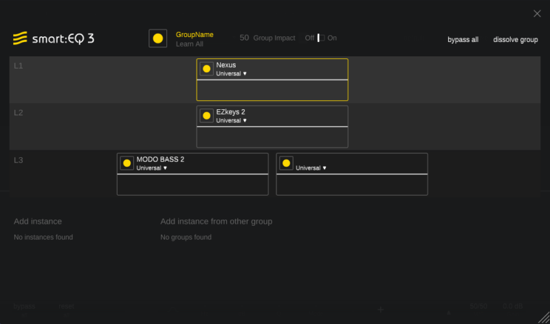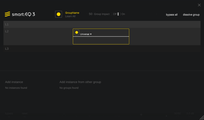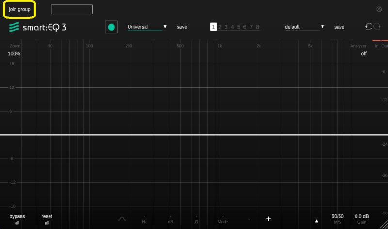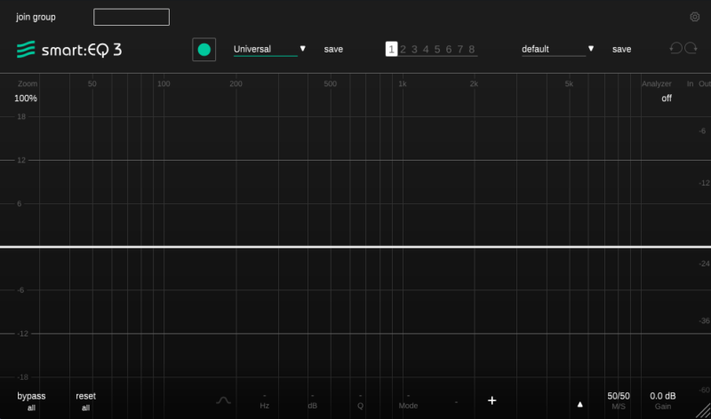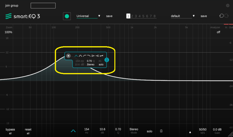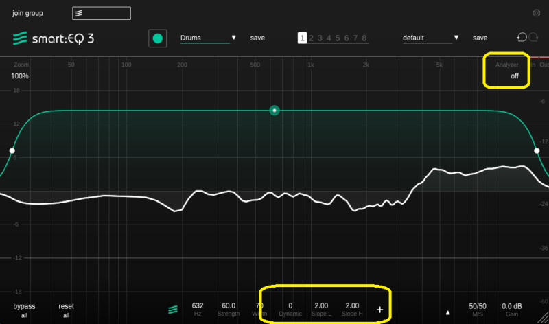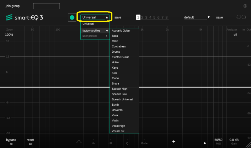 smart:comp同様、音源を選んで、緑の丸を押して、音を鳴らすと自動でEQを設定してくれます。