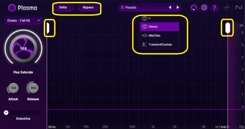 Stereo・Mid/Side・Transient/Sustain・Frequency・Delta・Bypass