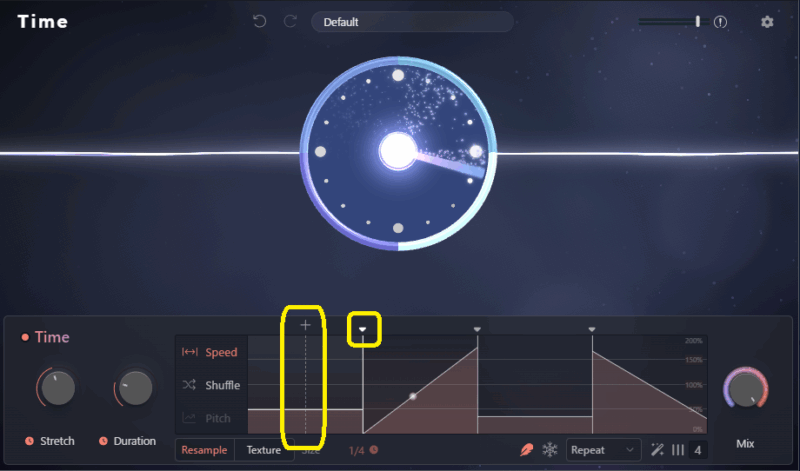 Stretchと違い、分割されている部分ごとに上げ下げしたり、斜め(徐々に速度を上げる/下げる)にしたりできます。