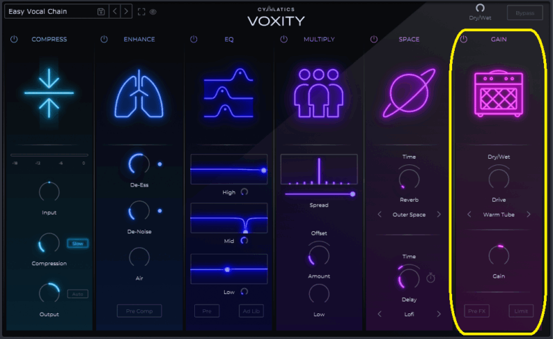 ここにDrive、つまり歪み、というよりはサチュレーションが入っています。