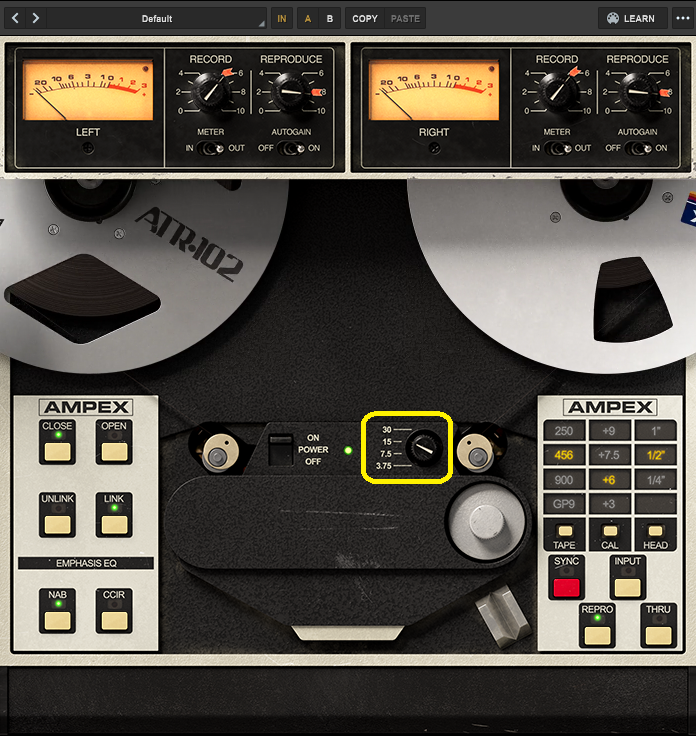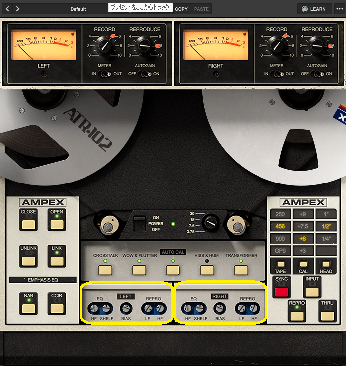 TAPE SPEEDの違いによって、倍音の付加のされ方も違うし、EQ的な感じに、周波数的なバランスもちょっと変わります。