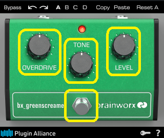 OVERDRIVEがオーバードライブで、TONEは左が低音、右が高音の強調。