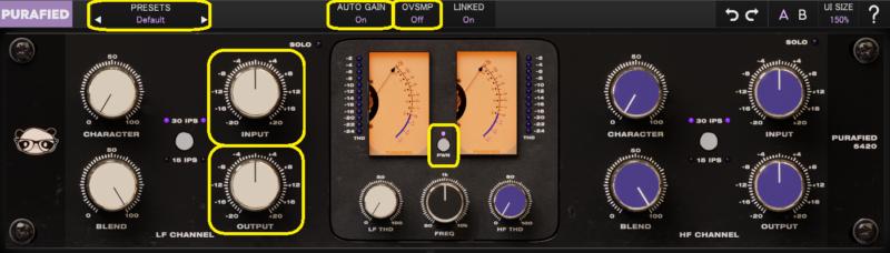 PWR・PRESETS・INPUT・OUTPUT・AUTO GAIN・OVSMP・MODE
