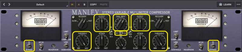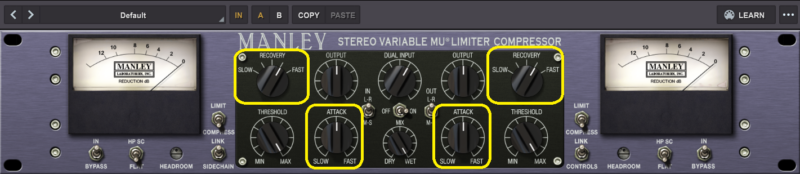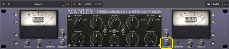 2つのコンプレッサーのダイナミクス制御信号サイドチェーンは連結されており、両者は常に同じ量の圧縮をする。