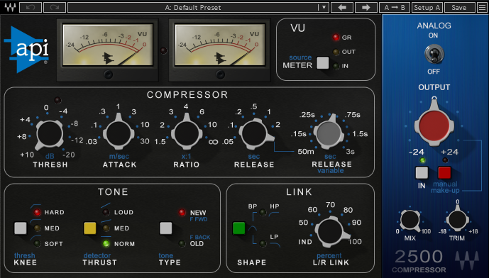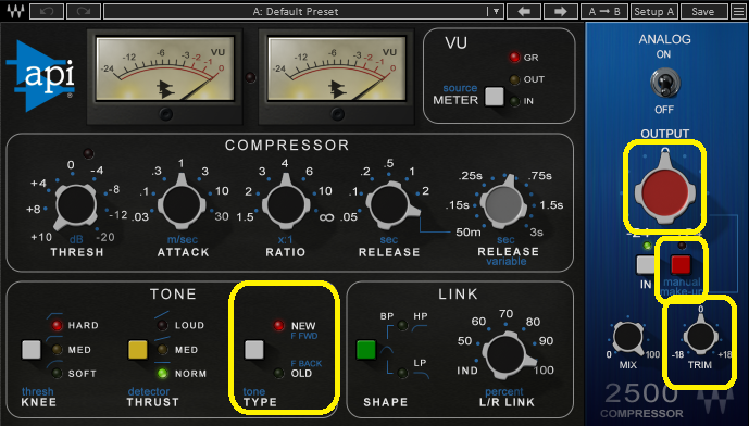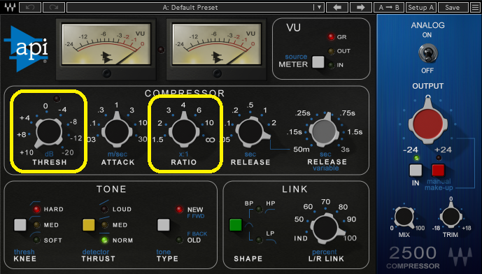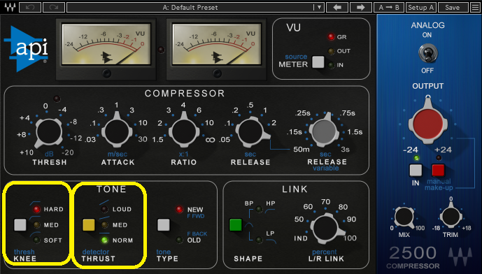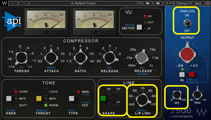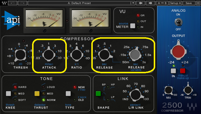 トリガーから、低音をはずすのが一般的ですが、API 2500は低音に反応しにくくして、高音に反応しやすします。