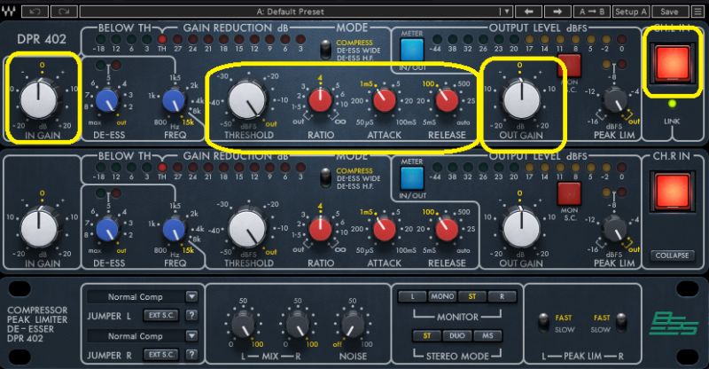 IN GAIN・OUT GAIN・THRESHOLD・RATIO・ATTACK・RELEASE・CH IN