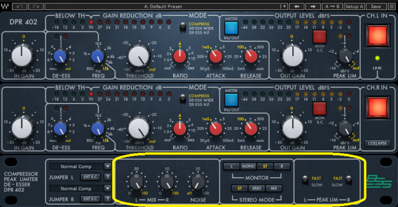 MIX・NOISE・MONITOR・STEREO MODE・PEAK LIM FAST/SLOW