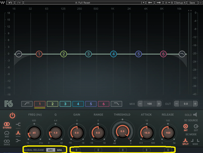 これは、GAIN、RANGE、THRESHOLD、ATTACK、RELEASEに関して、6バンド一括で上下するつまみですね。