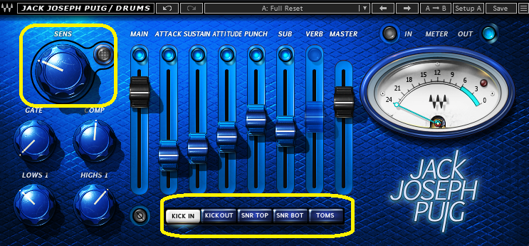 KICK IN、KICK OUT、SNR TOP(SNARE TOP)、SNR BOT(SNARE BOTTOM)、TOMSの5種類があります。
