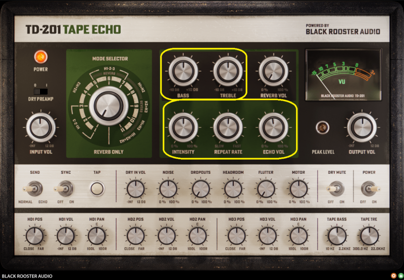 BASS・TREBLE・INTENSITY・REPEAT RATE・ECHO VOL