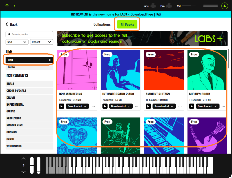 で、「All Packs」を選んで、「FREE」を選ぶと、フリー音源が全部出てくるので、全部ダウンロードしていく。